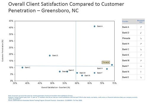Perhaps the most telling graphs in the entire Greenwich Associates report plot two different data points against each other: Overall Satisfaction and Market Penetration. In market after market, throughout our footprint, we see Pinnacle on one end of the Satisfaction plot and our largest, most well-known competitors at the other. More often than not, those large national and regional competitors have double-digit market share – sometimes north of 20 percent – and Overall Satisfaction hovering around just 50 or 60 percent – representing great vulnerability at the banks with the largest number of clients.