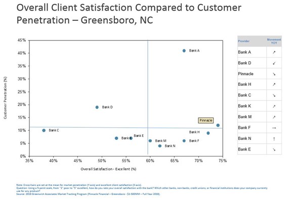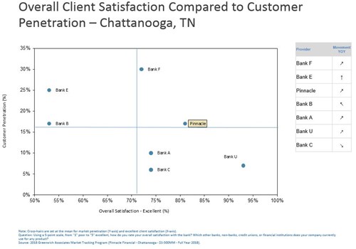 Perhaps the most telling graphs in the entire Greenwich Associates report plot two different data points against each other: Overall Satisfaction and Market Penetration. In market after market, throughout our footprint, we see Pinnacle on one end of the Satisfaction plot and our largest, most well-known competitors at the other. More often than not, those large national and regional competitors have double-digit market share – sometimes north of 20 percent – and Overall Satisfaction hovering around just 50 or 60 percent – representing great vulnerability at the banks with the largest number of clients.