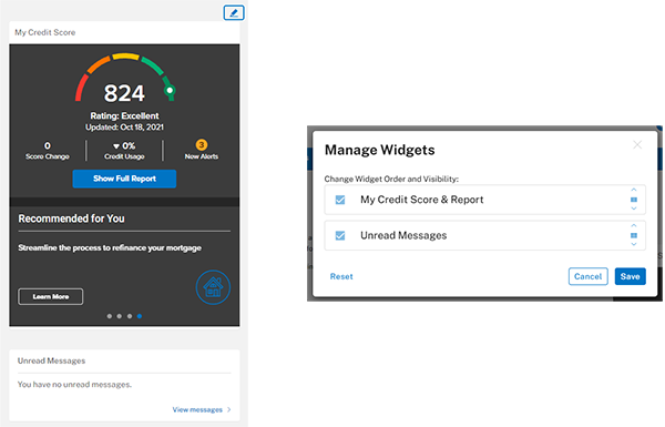 My Credit Score is one of the widgets available in Online Banking. Widgets are in the right-hand column on the Overview page. You can personalize which widgets appear by clicking the pencil icon and unchecking the widgets you want to hide or reorder them.